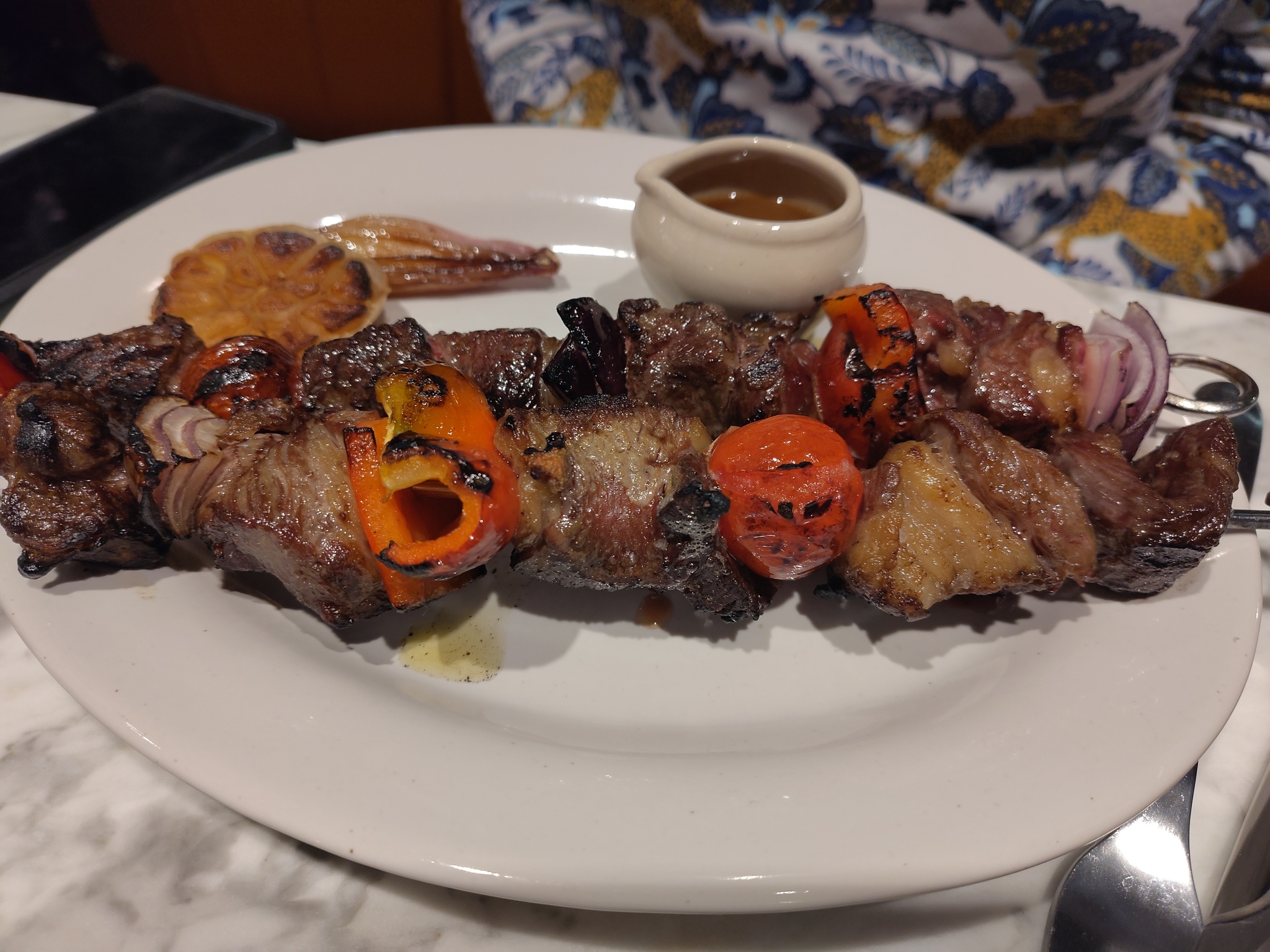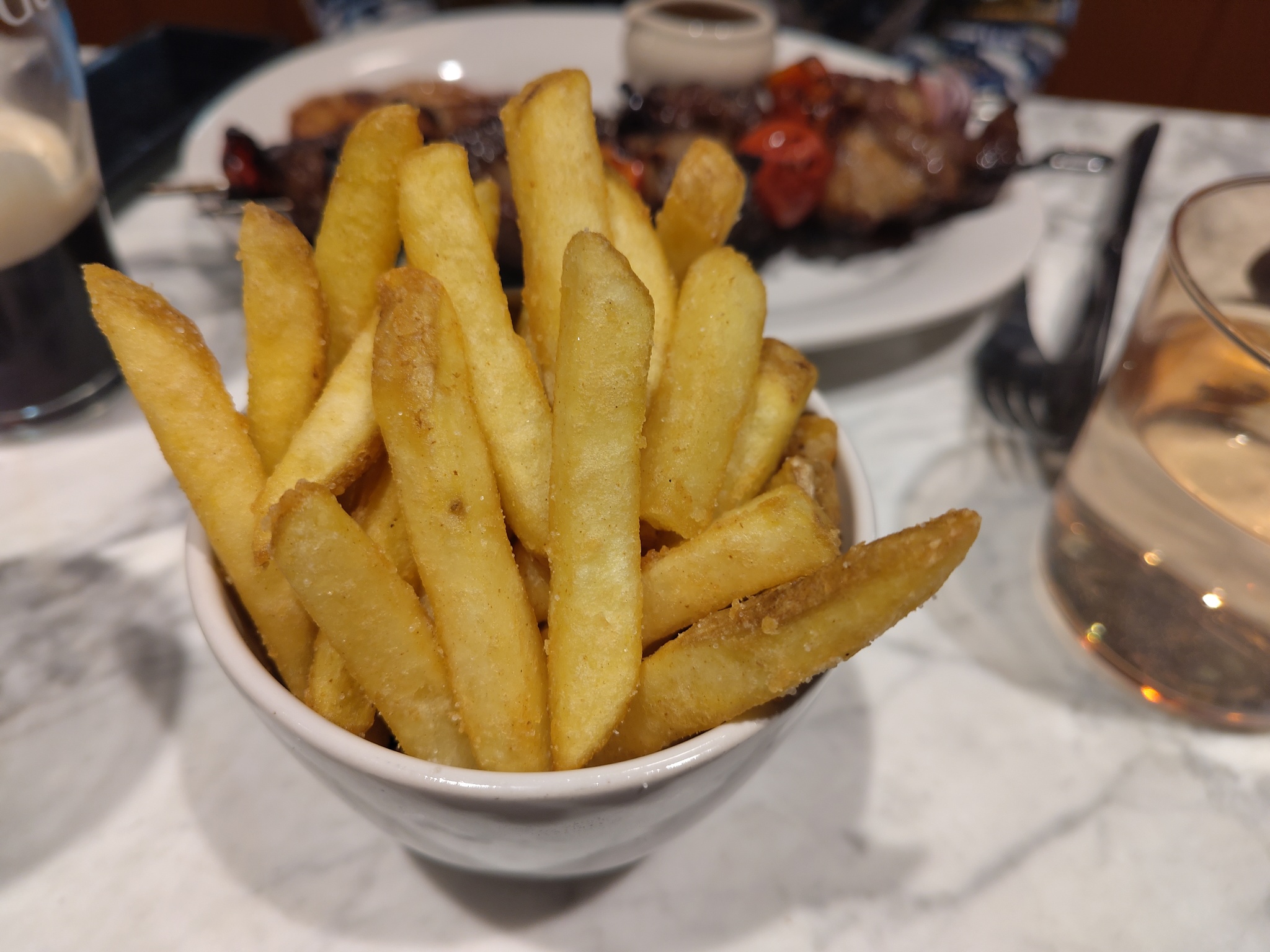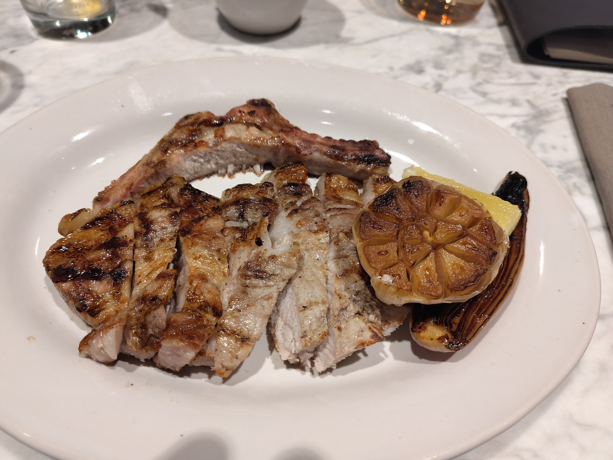 For her main, my wife had the butcher's skewer; lovely cubes of rib-eye, marinated, and grilled on a skewer with red peppers, tomatoes, and red onion slices. I had the pork chop, which came with half a roasted bulb of garlic, cut through horizontally. I enjoyed prising the sweet roasted cloves of garlic flesh out of the papery skin. My meal was seasoned, and nicely moist. We ordered some chips on the side, which were crisp and fluffy. The serving of mayonnaise was too small, but I nearly always find that his the case.