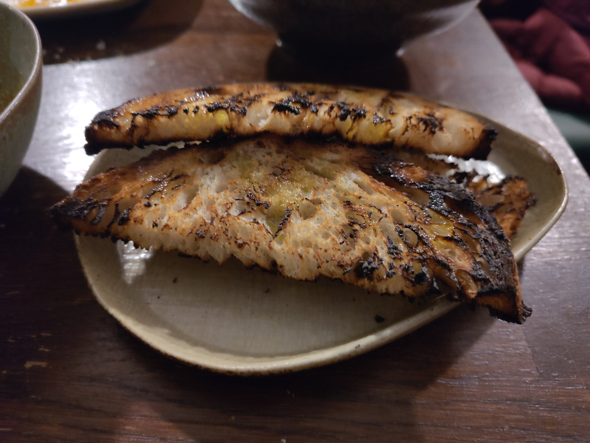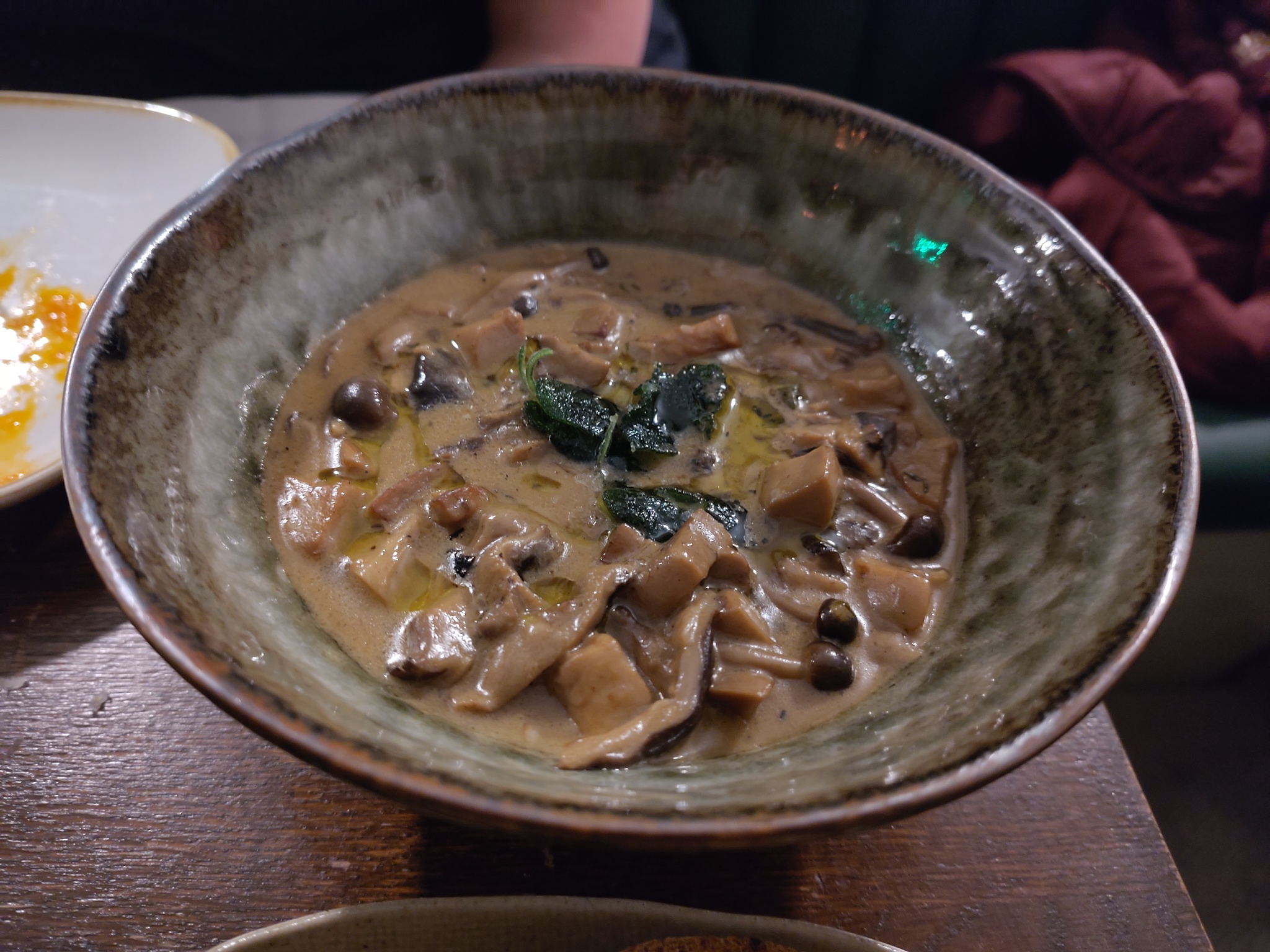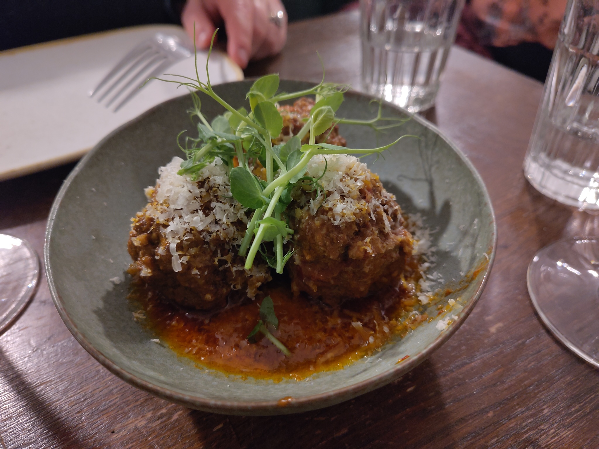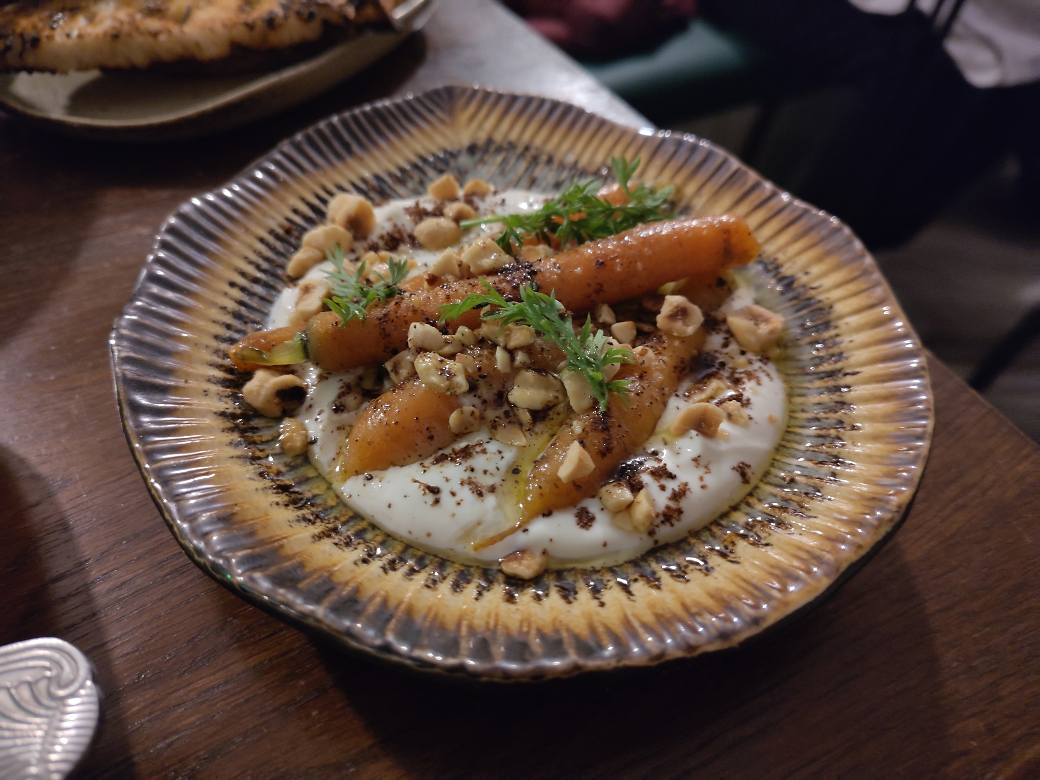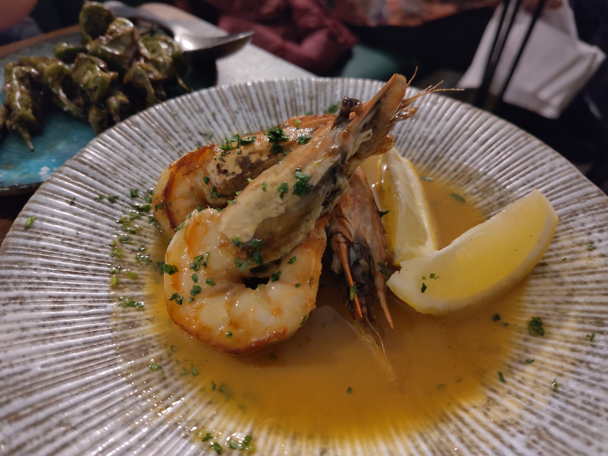The dishes were served in a random order, with the meatballs first. They were served with a spicy Nduja sauce and topped with grated cheese. The baby carrots were served with some yoghurt, a Labneh, and had some toasted hazelnuts sprinkled over it. The wild mushrooms came with some toasted sourdough, which was great to lap the remaining juices up with. The gambas were whole, but it was easy to remove the flesh from the shell. Some focaccia on the side helped with the cooking juices again.