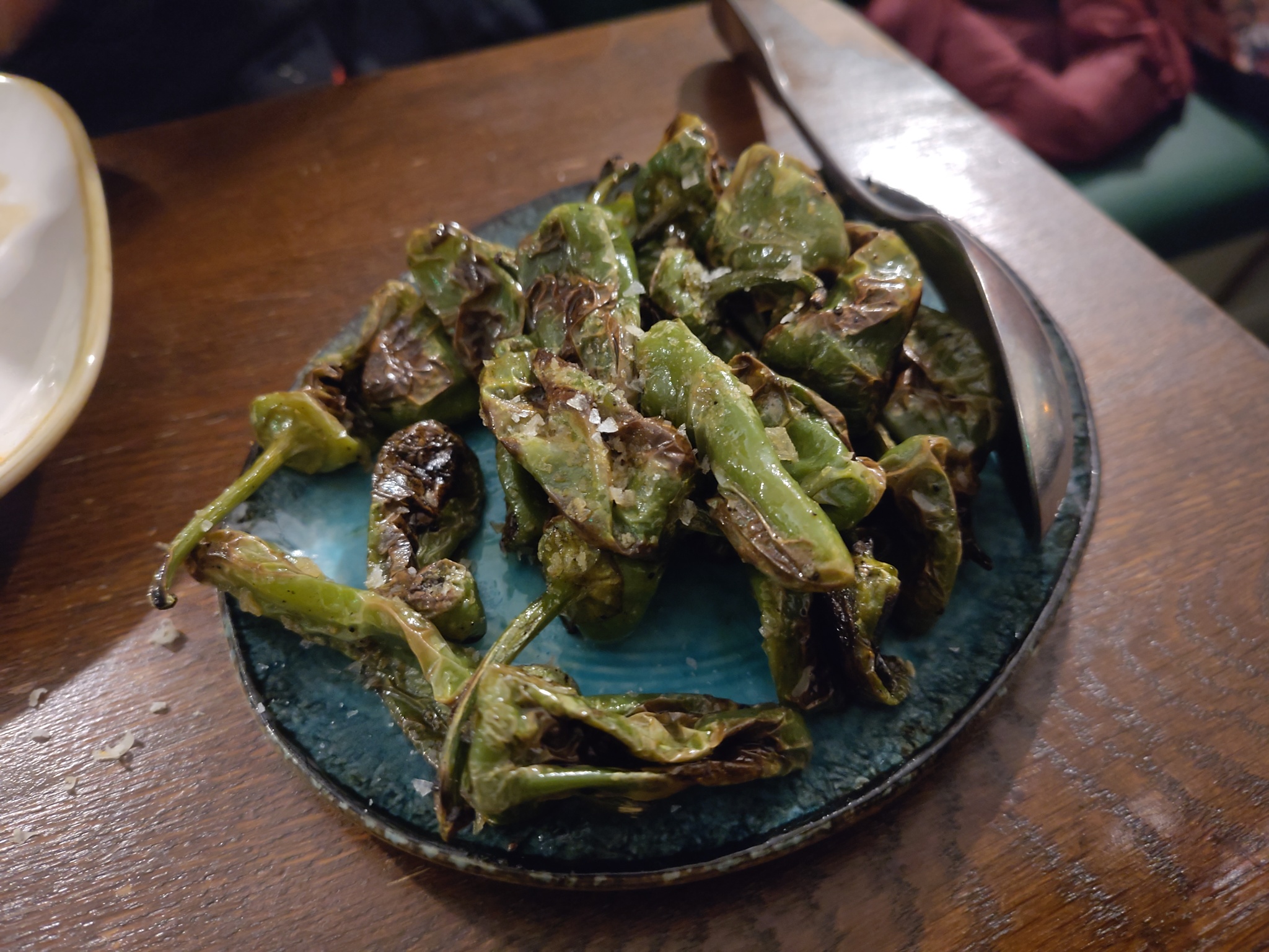 The menu contains of a few bar snacks, and a dozen or so sharing plates — tapas style. We ordered the Padron Peppers from the snack menu, and the Gambas al Ajillo, Baby Carrots, Woodland Wild Mushrooms, and meatballs from the "To Share" section.