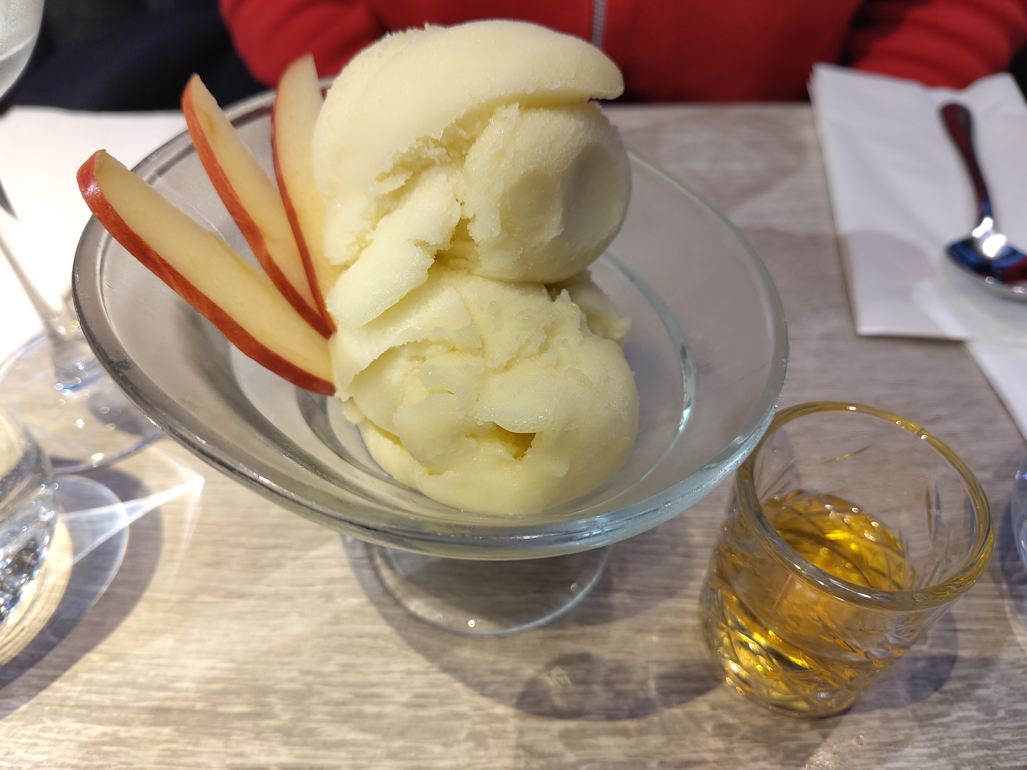 The food was nice, but the service was quite haphazard. Orders went slightly wrong, and were offered food that we hadn't ordered — nor did the tables next to us.