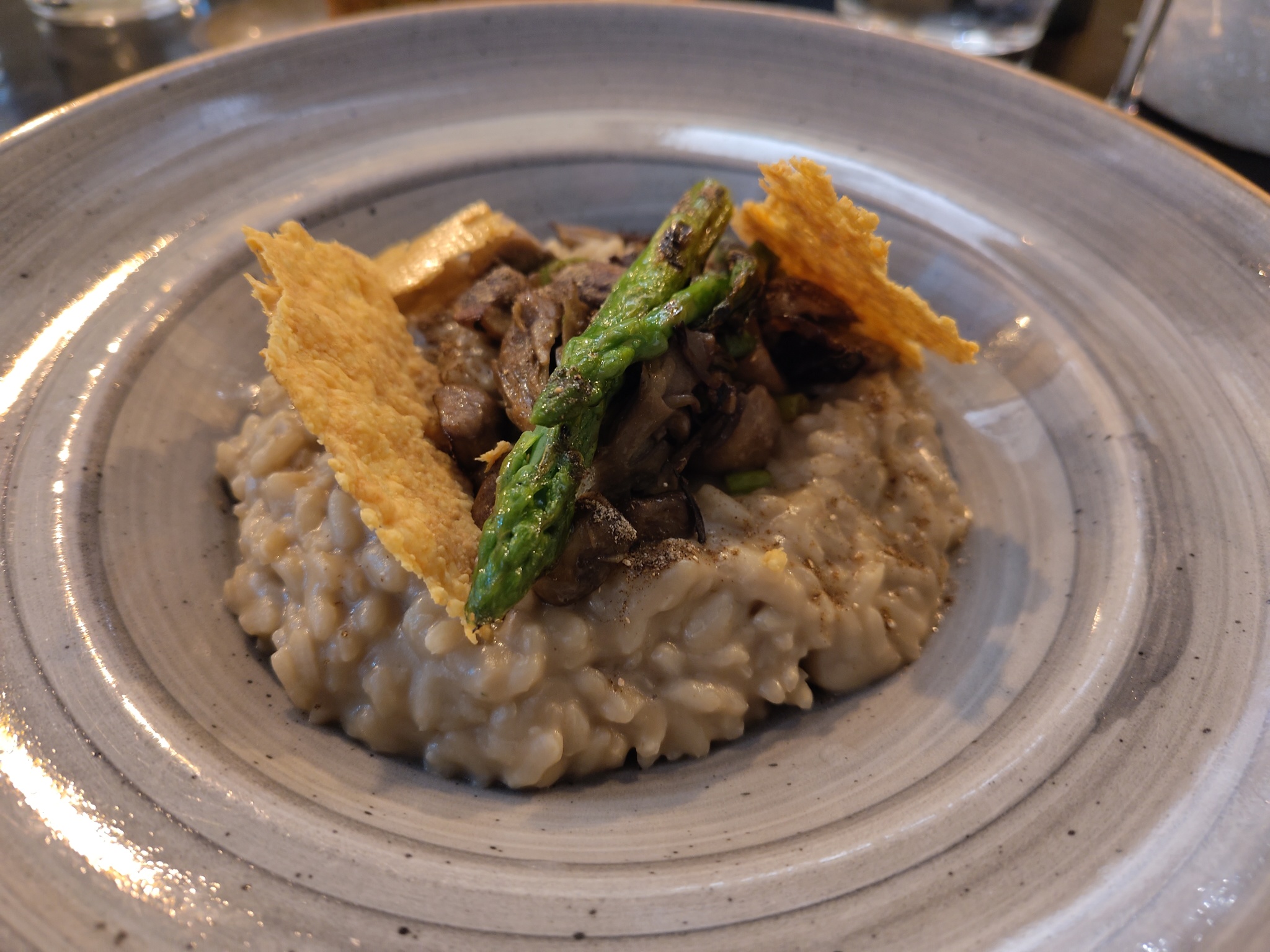 For our mains, I selected the Woodland Mushroom & Asparagus Risotto, which came with some Parmesan crackling. The risotto had a good bite to it, which I like, but it was a little skint on the asparagus. My wife chose the Cured & Roasted Loin of South Coast Cod, served with some fresh peas and brown shrimp on top. Although tasty, the portion was disappointingly bijou, and the fresh peas in the description turned out to be a quenelle and a smear of pea purée.