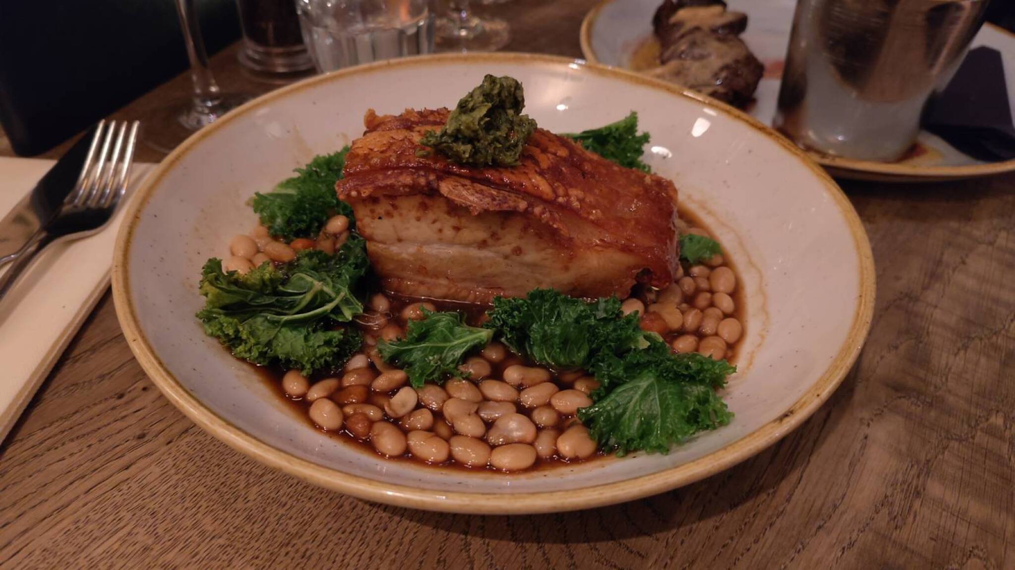 For our starter, we picked a scotch egg to share. It was nicely flavoured with a runny yolk, and was served with a sweet curry sauce. For my main I choose the slow roast free-range pork belly, served with white beans, winter kale, salsa verde. The skin wasn't particularly very crackly, and a little chewy at times. The white beans were OK, but could have been a bit softer too. My wife had the onglet steak, which was served with gentleman's relish and fries. The fries were nicely cooked and crispy, but the steak was cooked medium to well-done, rather than the ordered medium rare.